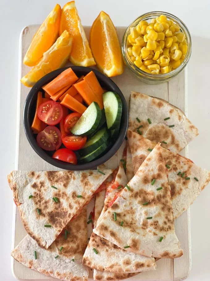 Make a cheese quesadilla, let it cool, and cut it into triangles. Pack with salsa for dipping and a side of fresh fruit.