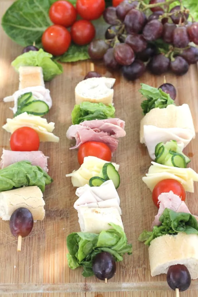 Thread cubes of bread, cheese, ham, and cherry tomatoes onto skewers for a deconstructed sandwich that’s fun to eat.